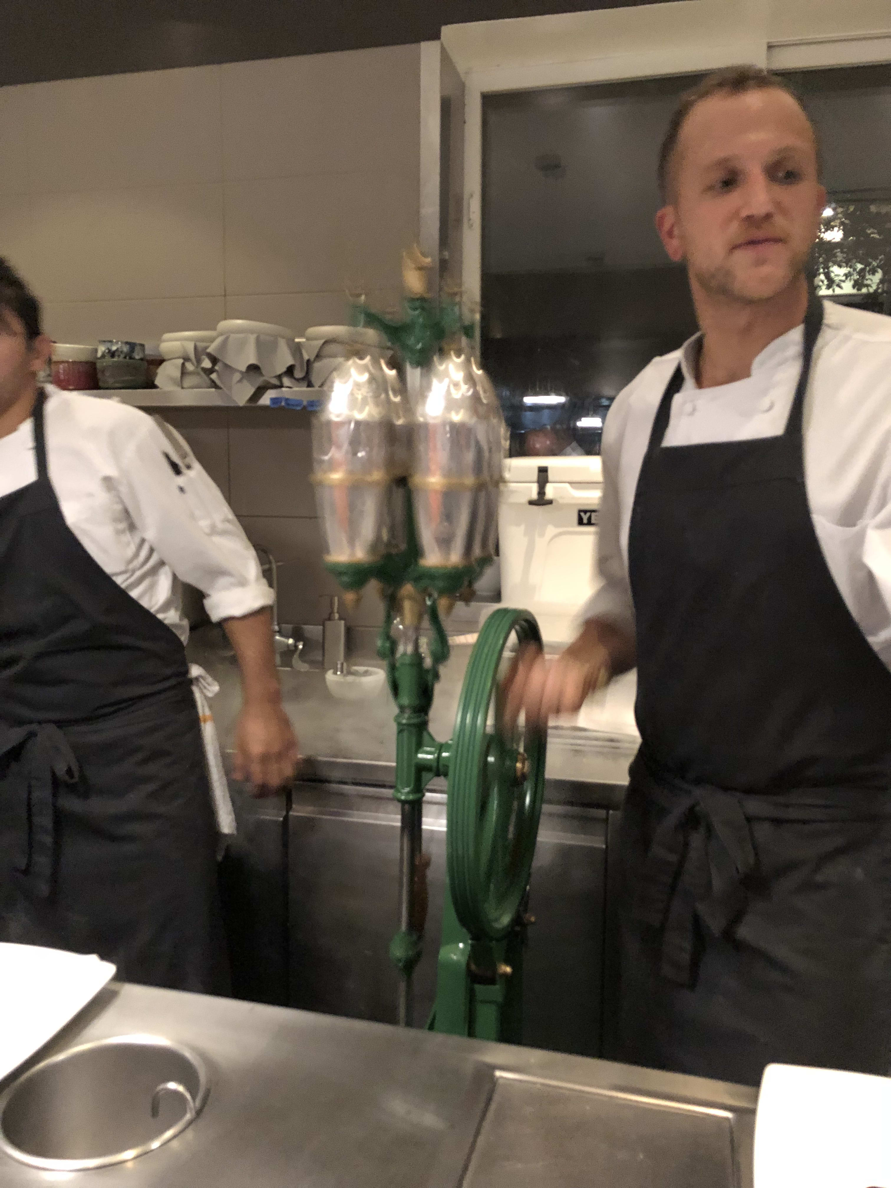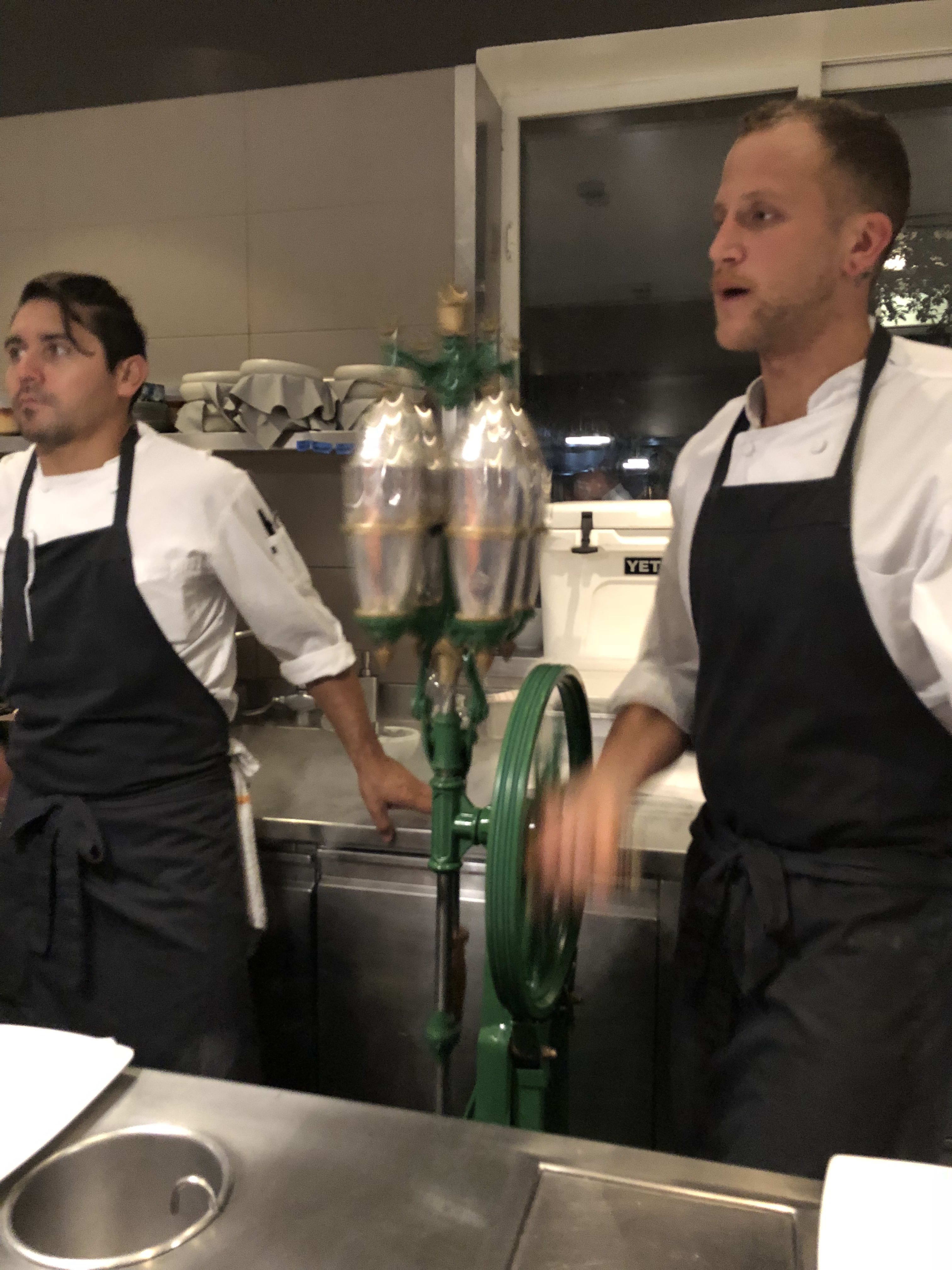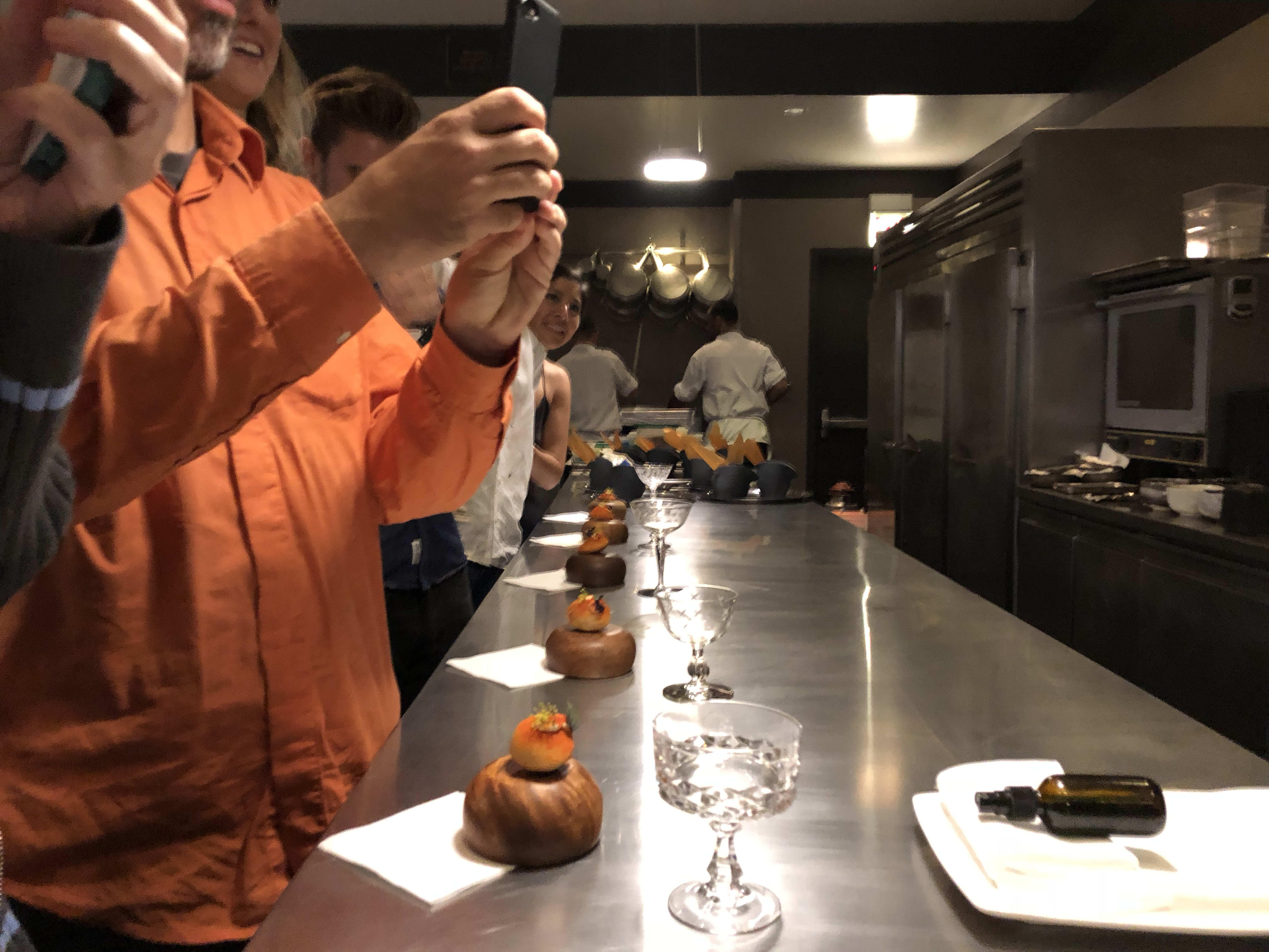 At another point, we were all led to the kitchen to be presented with a root beer style cocktail and a pizza pocket inspired dish. (Both were delicious.)