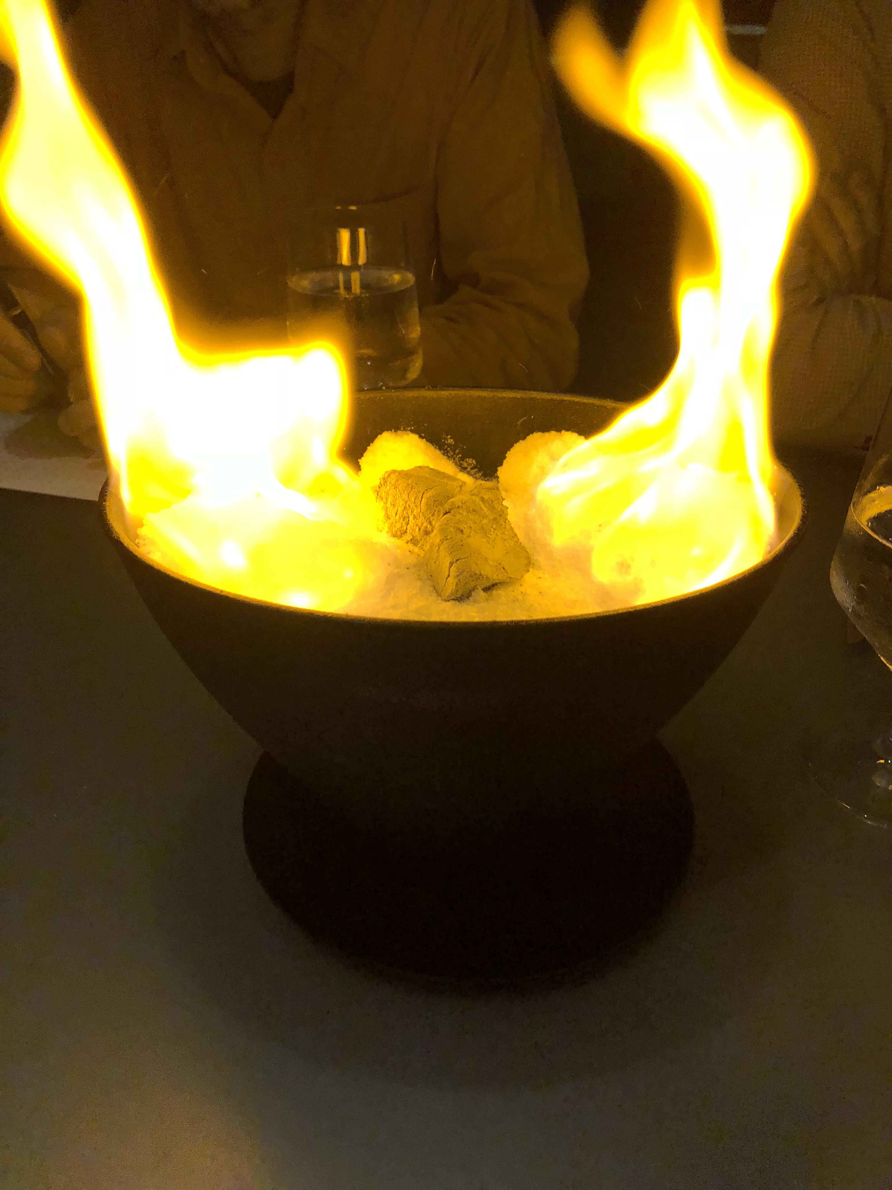A bowl of salt was lit on fire at one point with embers on top. Later it was revealed that a baked potato lay underneath and was one of the dishes.