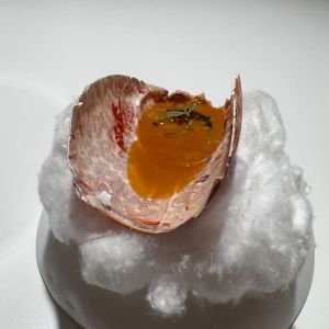 We then return to the more eclectic presentations. A three foot tall elephant looking straight out of a Beatles video was placed table-side with an Indian-inspired pani puri topped with lobster claw. Lobster head vindaloo presented in a shell on a cloud of cotton had me a bit worried due to my recent experience at Elkano but I really enjoyed it. This was my least favourite dish of the evening, which is saying just how consistently amazing all the dishes were this evening. Finally, Galician lobster was served with a mature tomato butter massala, sushi rice, tomato chutney, and buffalo butter. The sushi rice was an odd choice but thankfully didn’t detract from the dish.